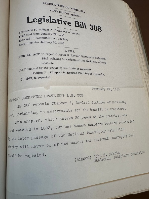 Nebraska's LB 308 & Committee Statement from 1945 By: Donald L Swanson Nebraska hasn’t had an assignment for benefit of creditors (“ABC”) statute since 1945 . . . until now. On February 27, 2026, the Nebraska Unicameral Legislature passed the Uniform Assignment for Benefit of Creditors Act (LB 783) by unanimous vote, and on March 3,... Continue Reading →