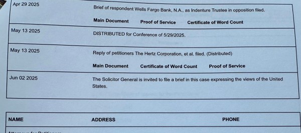 By: Donald L Swanson “Jun 02 2025 The Solicitor General is invited to file a brief in this case expressing the views of the United States.” That’s the latest entry by the U.S. Supreme Court on its electronic docket for Case No. 24-1062, The Hertz Corporation, et al v. Wells Fargo Bank, N.A., as Indenture Trustee.... Continue Reading →
